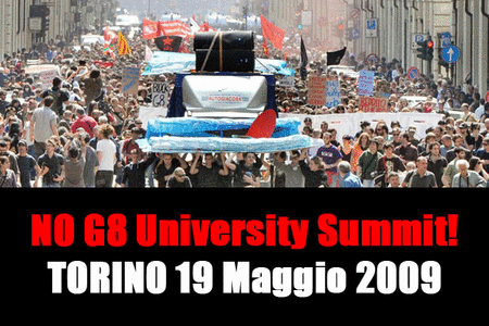 The students tried to break through a security cordon around the Valentino castle where 40 university rectors from 19 countries were meeting as part of a G8 preliminary meeting.