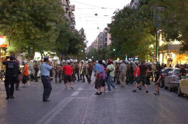 During the 7 July march, Greek fascists in full and open cooperation with the cops fiercely attacked the anarchists who were simply demanding equality for immigrants. This time the fascists tried to use the traditional people's weapon, the molotov cocktail, against the people themselves. Photos taken by comrades during the march, at great personal danger (as cops are known to severely beat and arrest anyone having cameras, even journalists from Greece or abroad) clearly show fascists inside the cop formations wielding lit molotov cocktails, ready to launch them against defenceless comrades who fight for a just world. It becomes apparent that their intention was to injure, or even kill, anarchists, and those who regularly watch news about class war in Greece should remember that fascists attempted (unsuccesfully) to throw a hand explosive grenade against the Greek Conscientious Objectors Association during one of their meetings (in Greece there is forced conscription for all males), clearly showing that they intended to kill numerous people.