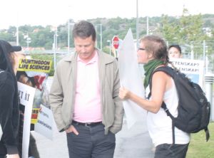 Starting off with a bang there was a noisy demo at AstraZeneca's site in Lund, with the guilty workers zooming past us, trying to enter without facing the images of the reality of dealing with HLS. Around one side of the building, the staff closed their main gates, forcing confused workers to reverse back and unable to enter their workplace. Good going AstraZeneca, work as usual we see?