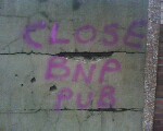 There is, in bright red paint, Close BNP Pub, on a wall belonging to the pub to the rear, near the back garden.