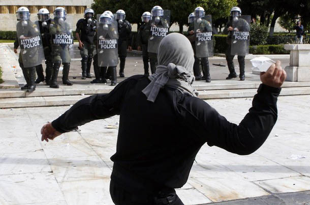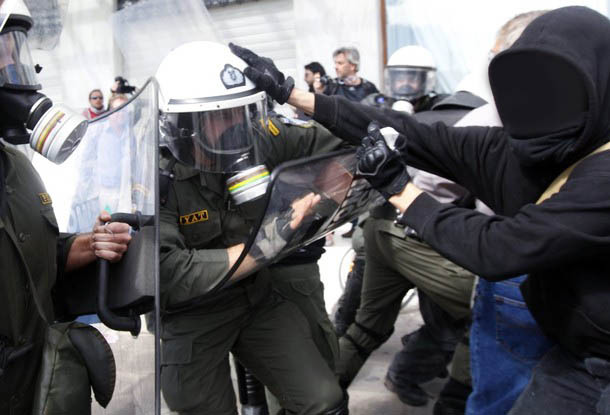 •Gatherings and demonstrations all around Greece against the Greek government's and EU's austerity program. In Athens more than 10.000 people in the gathering of PAME and almost the same number in the gathering of out-parliamentary organizations to express their opposition to the new slavery plans. Mr. Panagopoulos, the head of GSEE (General Confederations of Workers Greece) was attacked with yoghurt, coffee and water when he tried to make a speech among the protestors; the anger of the workers rised up and some clashes with him and his bodyguards took place. Just to remind about him, this pimp of the workers' rights, has refused during the last days to announce an official General Strike for today, day when the governors voted for the austerity program. The special pigs' units sprayed also teargas on the face of Manolis Glezos, 88 years old, when he tried to take a youngster away from the pigs' hands and avoid this arrest. Manolis Glezos took down the German Nazi flag from Acropolis in May 1941 and now in 2010 was attacked by the servants of neoliberal economical plans. After the attack against Glezos, many people moved against the pigs in front of the parliament and took away their shields, helmets and other "democratic" equipment of them. Many clashes with cops also in front of Arsakeio school and at Propylaia area. The government gave order to evacuate the Labor Ministry, where people tried to brake the front door, but the pigs deffended the building. The General State Accounting offices squatted for one more day with strong clashes in front of the building. Many banks, street cameras, luxurious cars and shopping malls also smashed down. The National Printing bulding squatted by workers of the Inland Ministry to stop the printing of the new economical laws and condemn that the government keeps also a secret agenta. In total, 5 arrests in Athens; 2 persons accused with heavy crimes and 3 with light ones.