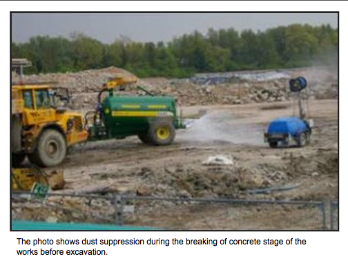 6)High Dust Suppression system, bloke with a tractor and water bowser trailer driving around the site,