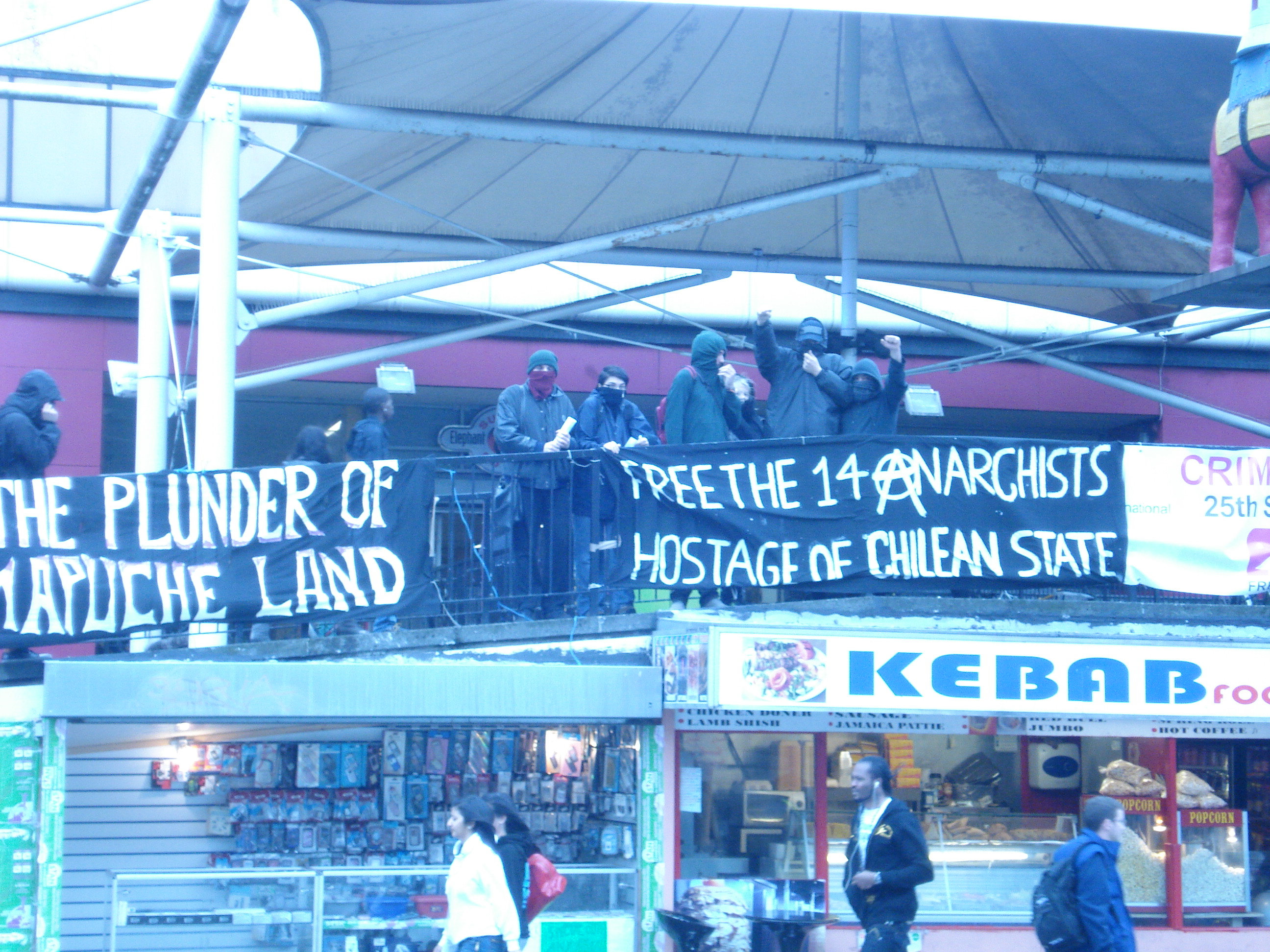 TODAY, Friday 24 September, around 2pm. a number of anarchists and sympathizers from various parts of the metropolis converged on the shopping centre in the middle of the busy intersection Elephant and Castle, south london chosen because of the thousands of people from Latin American countries living in the area. After dropping banners over the main entrance in solidarity with the Mapuche hunger strikers and the 14 anarchists arrested in Chile, they dispersed into and around the shopping centre and local market giving out hundreds of leaflets in English and Spanish.