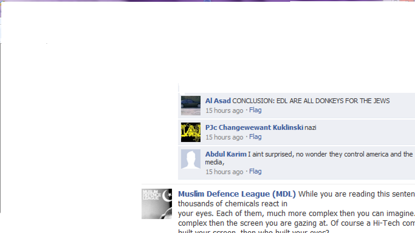 The Muslim Defence League member Zeeshan Younis has posted an antisemitic hoax claiming that Jews believe themselves to be the master race. Another MDL member [probably under a pseudonym] has written that "EDL are donkeys for the Jews." Foisal Uddin, the founder and leader of the MDL was thrown out of the original MDL group Muslim Defence League United We Stand Divided We Fall when he wrote "Hindus shag donkeys." [An obsession with donkeys it would seem...]