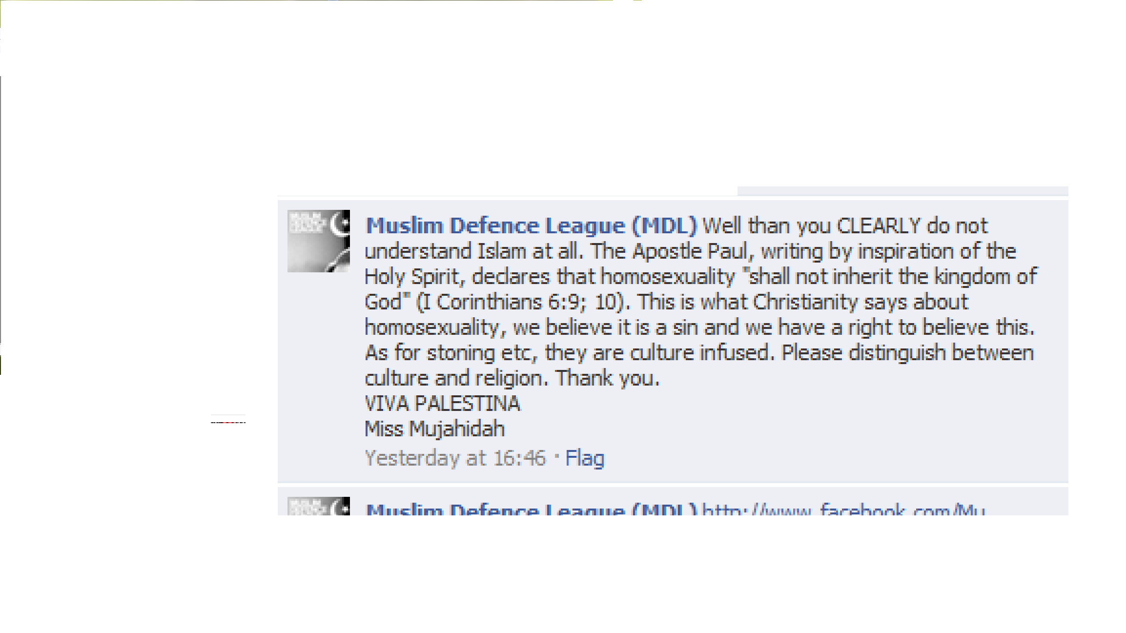 The homophobic comment made by one of the MDL's leadership Miss Mujahidah states that Christianity [like Islam] believes homosexuality to be a sin. The MDL have said homosexuality is a sin and that they have the right to believe this.