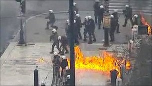 London last thursday, Rome yesterday and today Athens. A day of general strike across Greece sees protesters out in force and the inevitable happens - a third west European capital city sees riots in the space of a week. Cops have fired tear gas and flash grenades while rioters use molotovs and set fire to cars. A former transport minister has been stoned and protesters attempted to torch two luxury hotels near parliament. The economic blockade has paralyzed the country - grounding flights, shutting schools, halting public transport.