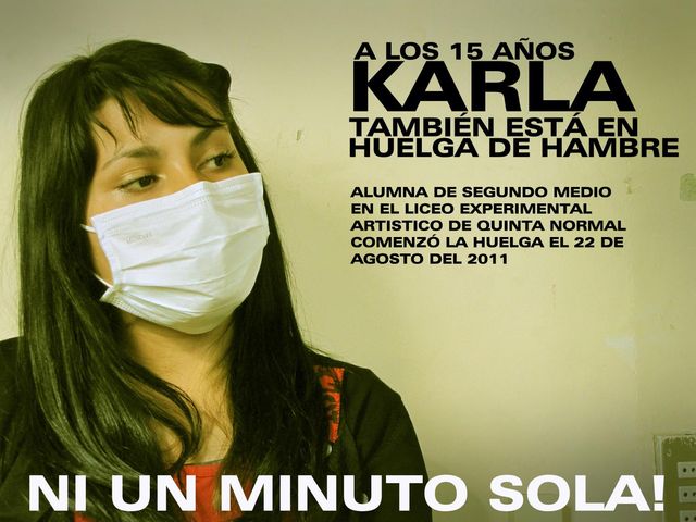 The school occupations began in Chile on 10 June, and Karla represents the third "generation" of hunger strikers since then. This is a country whose economy is sold as a model for all Latin America to imitate, but whose children have to study in sub-human conditions. The first strikers were three girls, they dropped their strike after 20 days suffering physical deterioration. Next came three men who lasted seven days before internal problems set in. Karla began her action on 22 August together with her friend Amapola (no longer on hunger strike). After three months the occupation seemed to be losing its enthusiasm and organisation, and the