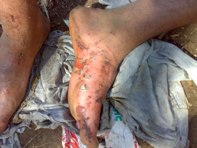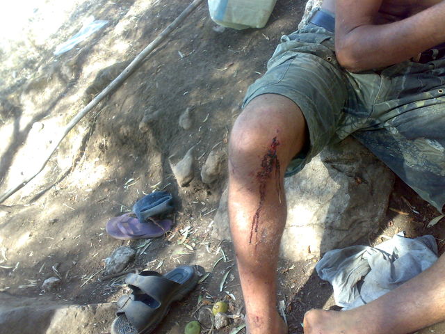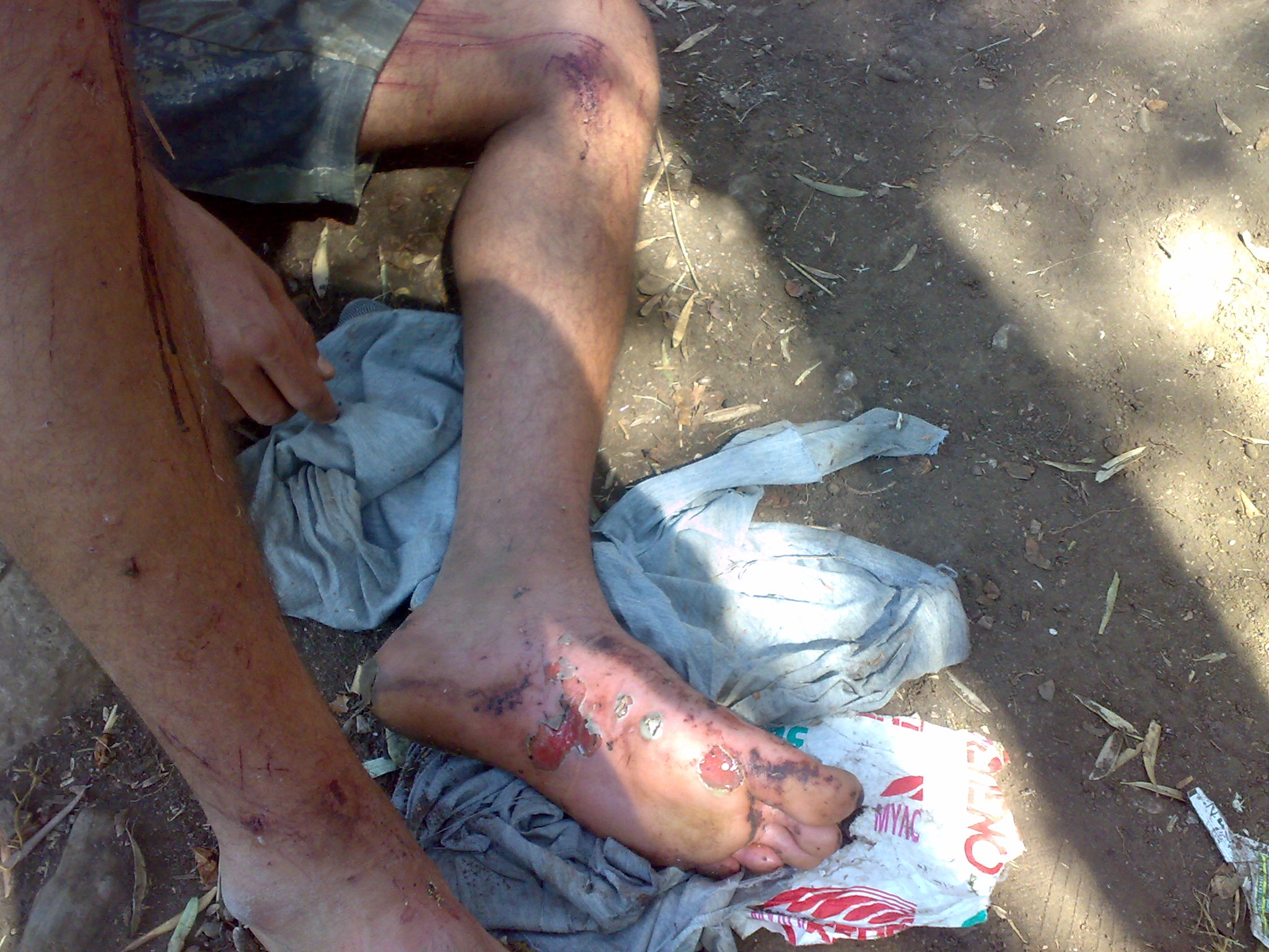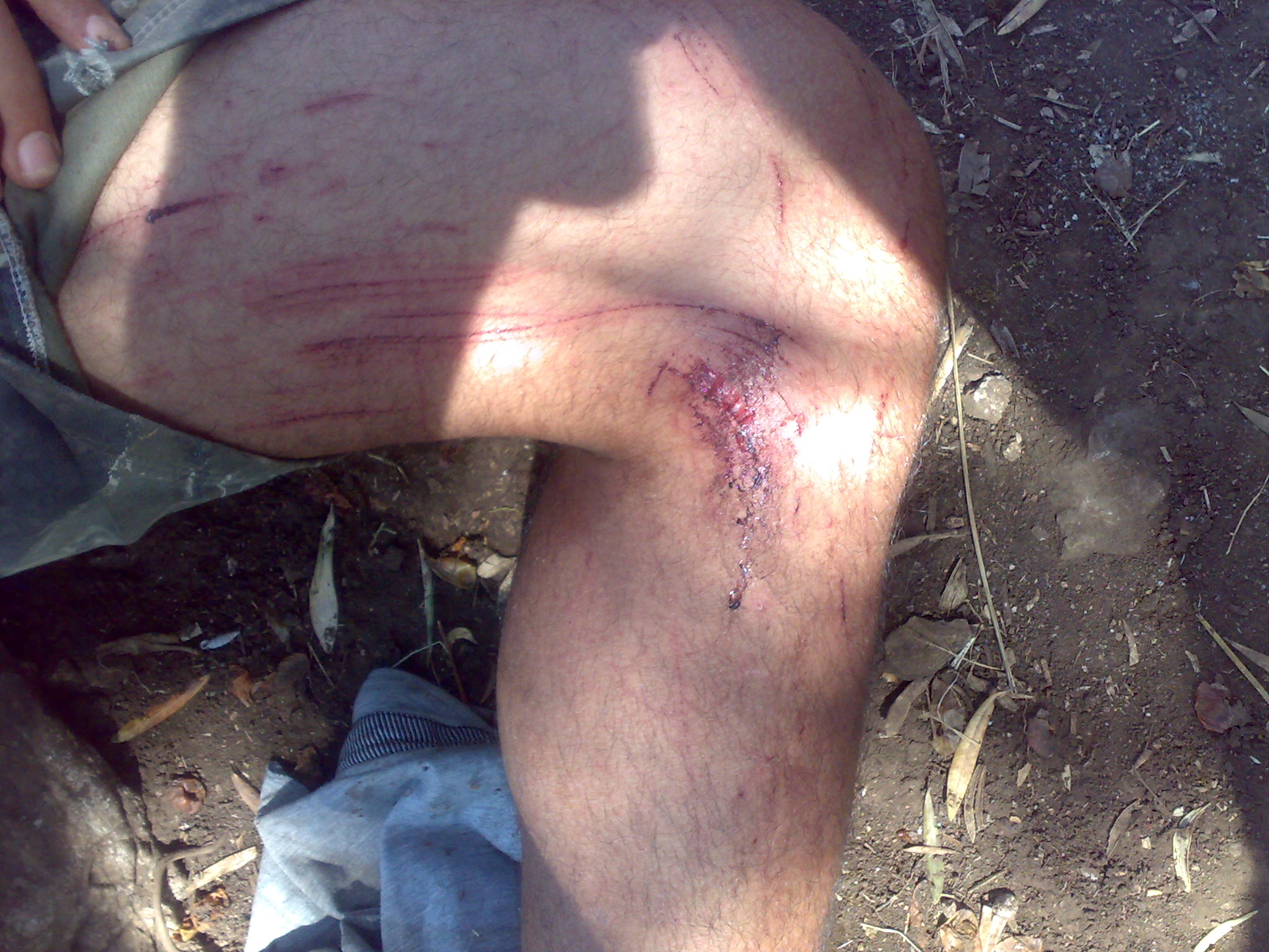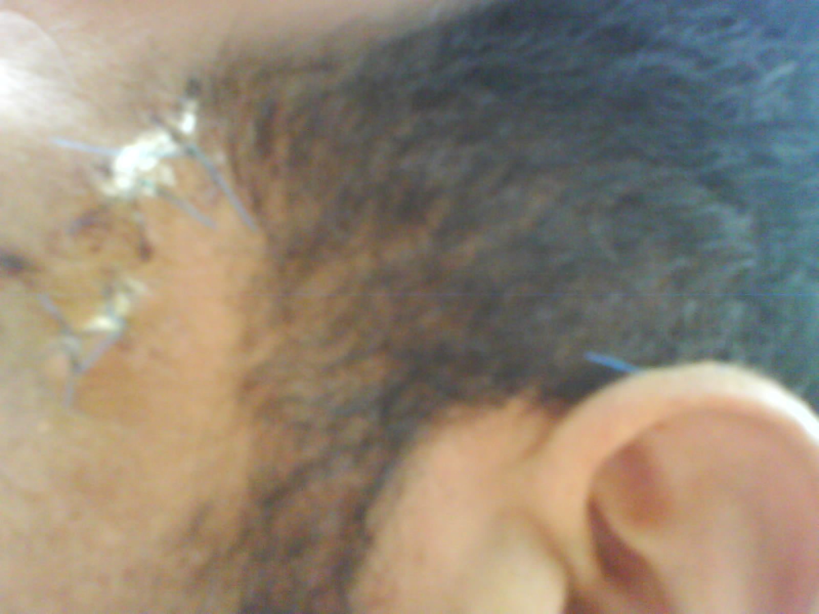 http://athens.indymedia.org/front.php3?lang=el&article_id=1326843 The remaining two pictures, which focus on the head (of another victim) with stiches above the ear, depict wounds reported to have been received by tear gas riffle-grenades shot at a straight line to the heads of protesters from a distance of 10 metres, by the forces of the Greek police during the protests which took place on May 2011.