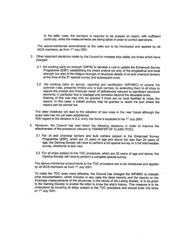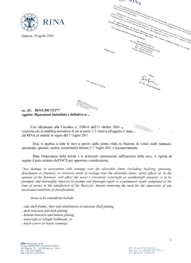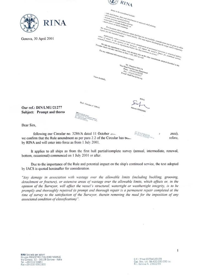 “With reference to the Circular 3286/A of the October 11, 2000 (here enclosed for ready reference) Confirms that the regulatory change in point 2.2 relative to the object has been adopted by IACS and, accordingly, by RINA will enter into force on 1 July 2001. It applies to all ships from the first visit (or fraction of visit) hull of the ship, (Annual, Special, hull, occasional) commenced on 1 July 2001 or later. Given the importance of the rule and the potential repercussions on the ship, we write here the text adopted by IACS for your timely consideration: “Any damage in association with wastage ober the allowable limits (including buckling, grooving, detachment or fracture) or extensive areas of wastage over the allowable limit, which affects or, in the opinion of the Surveyor, will affect the vessel’s structural, watertight or weathertigh integrity, is to be promptly and thoroughly repaired (a prompt and thorough repair is a permanent repair completed at the time of survey to the satisfaction of the Surveyor, therein removing the need for the imposition of any associated condition of classification). Areas to be considered include: 1) side shell frames, their end attachments or adjacent shell plating; 2) deck structure and deck plating; 3) bottom structure and bottom plating; 4) watertight or oiltight bulkheads, or 5) hatch cover or hatch coamings. For locations where adequate repair facilities are not available, consideration may be given to allow the vessel to proceed directly to a repair facility. This may require discharging the cargo and/or temporary repair for the intended voyage. Additionally, when a survey result in the identification of substantial corrosion or structural defects, either of which, in the opinion of the Surveyor, will impair the vessel’s fitness for continued service, remedial measures are to be implemented before the ship continues in service”.