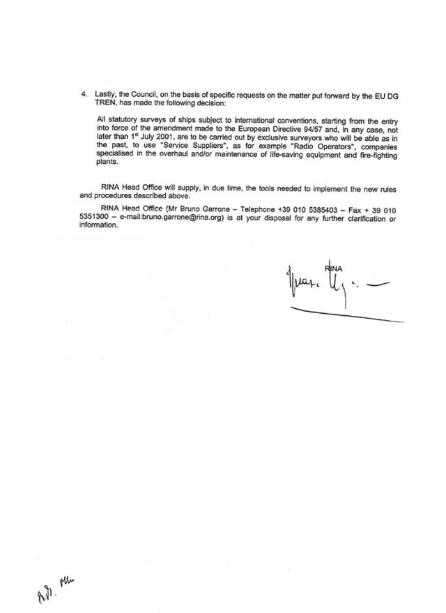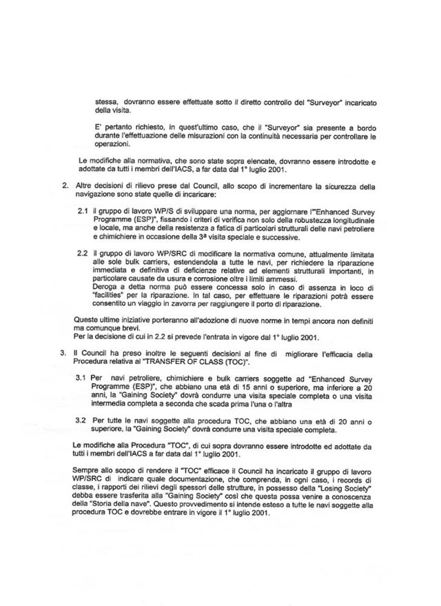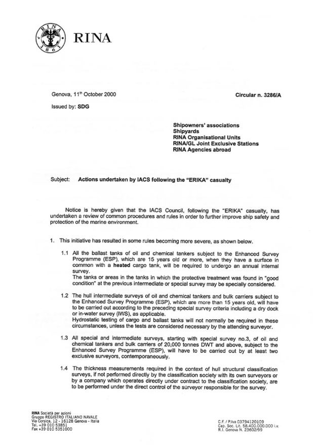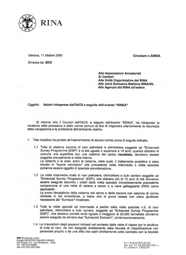 Indeed in the aftermath of the Erika disaster, all members of the British corporation organized emergency crisis unit in London proposed to rewrite certain rules governing the work of ship classification society. Infact In October 2000, only a few months after the incident in the Gulf of Biscay, had already prepared a draft regulation beautiful brand new. At the same time the Registro Italiano Navale prepared a draft letter to be sent to all companies of international navigation, shipyards, and all operators in the maritime sector. The circular letter of Rina is no. 3286/A that relates to: “Action undertaken by IACS following the ‘ERIKA’ casualty” e “Prompt and thorough repair of damage/waste significant structural items”. (see Rina copy circular letter attached and reproduced here pdf).
