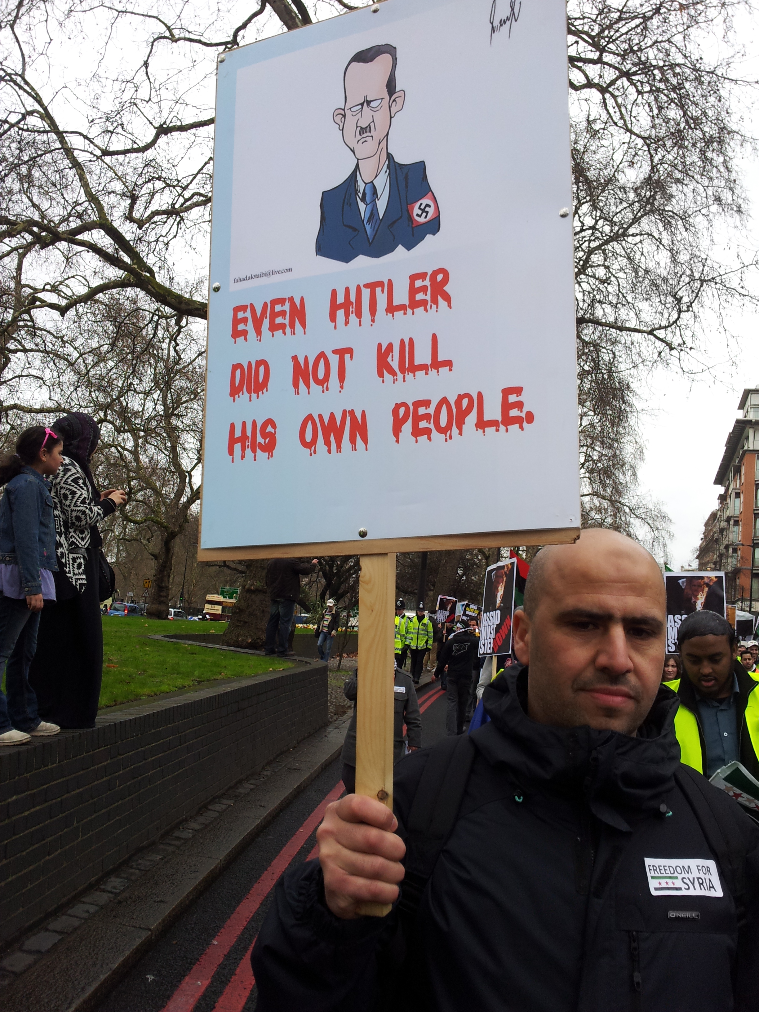 A demonstrator said, “I am here to send a message to the world & the Syrian people that I stand in solidarity with the Syrian people against the brutal suppression & oppression that their dictator Bashar Al-Assad has unleashed upon them, given the uprisings in Syria.” He explained that the uprisings were triggered by school boys writing anti-regime graffiti on the walls of a school, as a consequence their parents held a demonstration after their sons were tortured and from there the uprising spread across Syria.