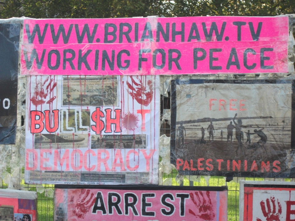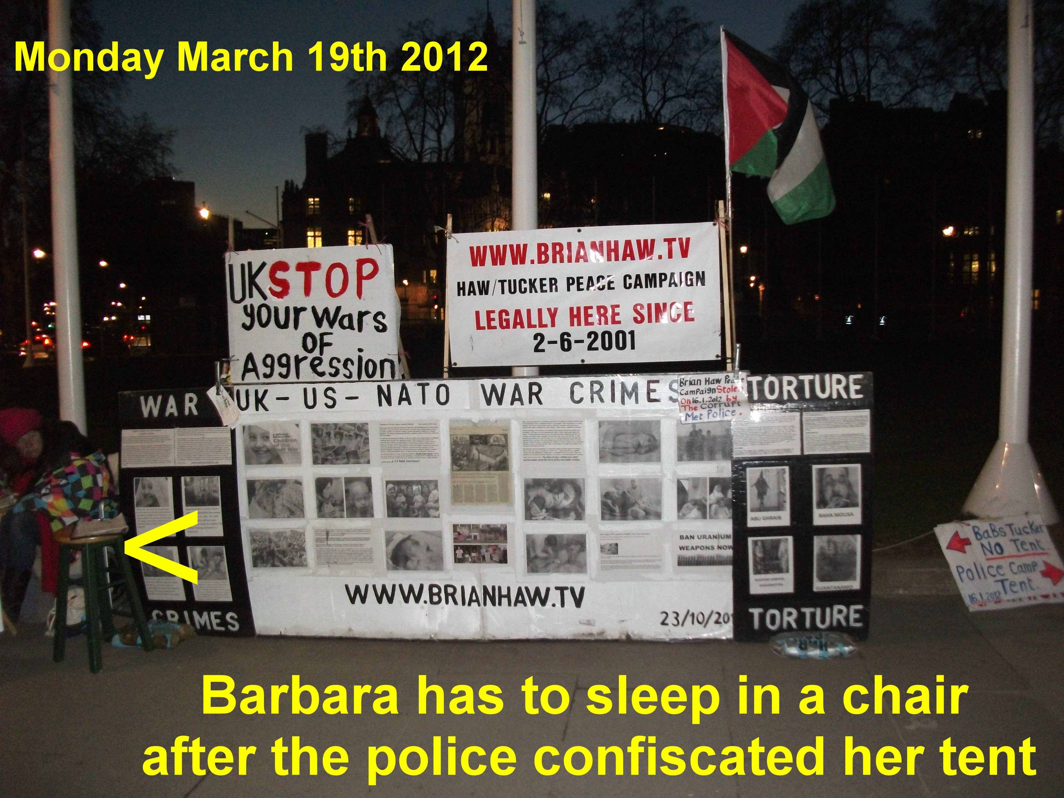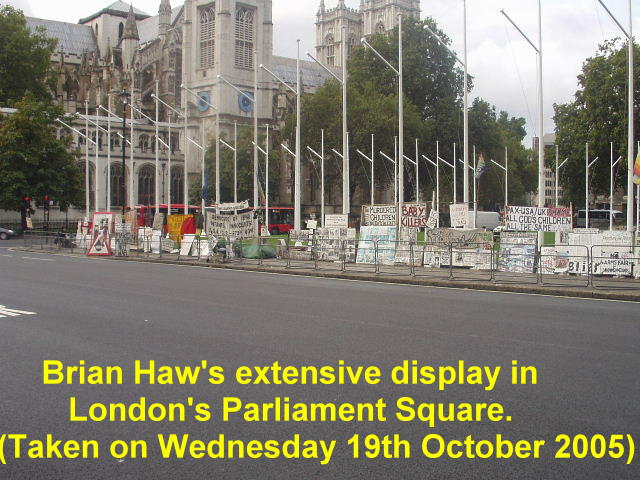. Parliament enacted the legislation SOCPA (Serious Organised Crime and Police Act). This poorly drafted piece of legislation was aimed specifically at Brian Haw and his peace campaign but he successfully argued it did not apply to him as his protest predated it. His huge collection of placards and banners was eventually reduced in May 2006 when an incredible 78 Police removed all but one of his placards in the dead of night at an estimated cost of £27,000. Still he would not leave the Square and clocked up 5 years that summer. He had been joined in December 2005 by Australian born Mrs Barbara Tucker and she assumed the helm when Brian sadly passed on from cancer in June 2011.