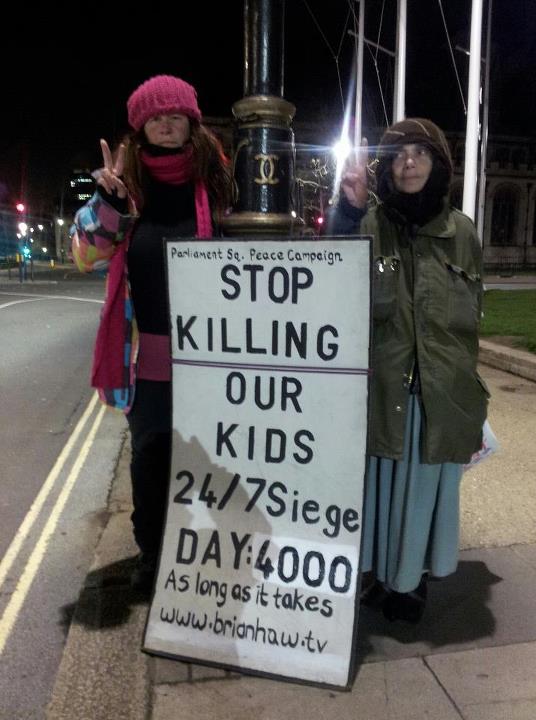 The long term 24/7 peace campaign in London’s Parliament Square today reaches day 4,000 – nearly 11 years. Since its inception on June 2nd 2001 by the late Brian Haw it has been a thorn in the side of the establishment. Sadly Brian passed away in June 2011 but the campaign has continued with Australian Barbara Tucker at the helm.