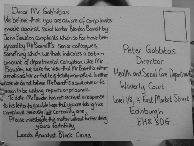 http://leedsabc.org/corrupt-social-workers-attempt-to-rid-themselves-of-prisoner-john-bowden/ All the indications are however that Barnett is not simply a silly little boy, he is rather a malicious liar abusing his position of power over a long-term prisoner. Unfortunately, when John Bowden made an official complaint, Barnett’s colleagues closed ranks, and are currently attempting to have John banished from Scotland, so letting Barnett (and themselves) off the hook. This corruption apparently goes right to the top, as John explains in his most recent article on the sordid affair: “I have now complained to Peter Gabbitas, Director of Health and Social Care Department in Edinburgh, who has overall responsibility for Barnett and his colleagues, and he has yet to even acknowledge my letter, which suggests a disinclination on his part to recognise either my existence or that of my complaint. Incredibly, it would seem that a pathological liar like Barnett has the absolute freedom to describe someone in an official report as a “racist and homophobic” serial killer without a shred of evidence, and absolutely no one in his entire department has the integrity or moral courage to criticise or expose him, and that apparently includes even the department’s Director. The complete absence of any basic integrity among those at Edinburgh Criminal Justice Services is both scandalous and deeply worrying for those under its supervision.”