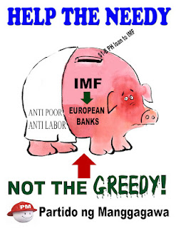 Renato Magtubo, PM national chair, insisted that “The $1B—which is the blood and sweat of our OFW’s—will harm our own migrant workers in Europe since the IMF’s austerity schemes dictate cuts in wages, reduction in social programs and liberalization of labor contractualization. By extending the loan to the IMF, our OFW’s and Europeans workers will earn less, lose public services and be easier to fire.”