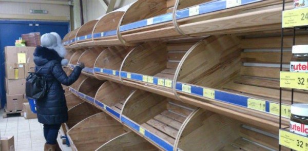 The collapse of Ukrainian hryvnia is still under way (only in January and February there was registered a 200% fall of hryvnia), doesn’t contribute to optimism that’s why the shelves in grocery stores are always empty meanwhile such foodstuffs like sugar, rice, buckwheat, and flour can’t be bought easily in Kiev. If one tries to google it’ll take just a minute to find this :