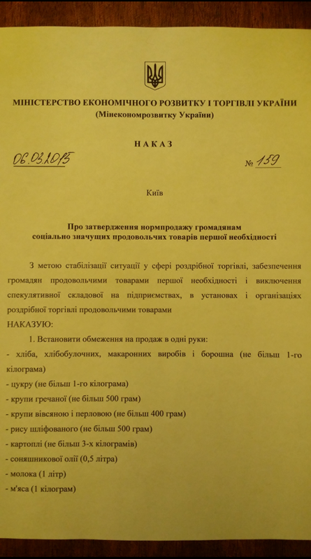 https://www.indymedia.org.uk/en/regions/world/2015/03/519700.html ) For its part, the Ministry of Economic Development and Trade of Ukraine headed by Abromavicius, a notable expert and an honored economist of Ukraine, issued an order ‘On retail trade norms of socially vital foodstuff commodities’.