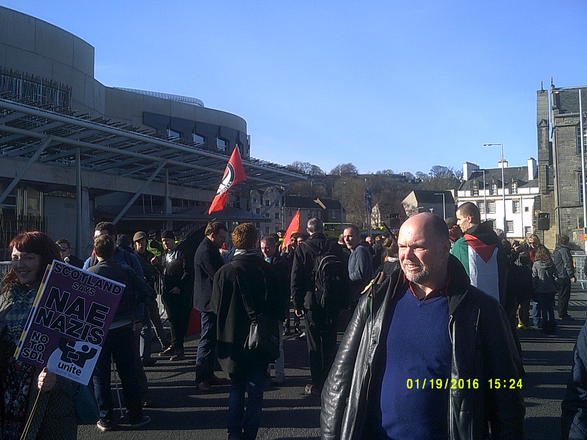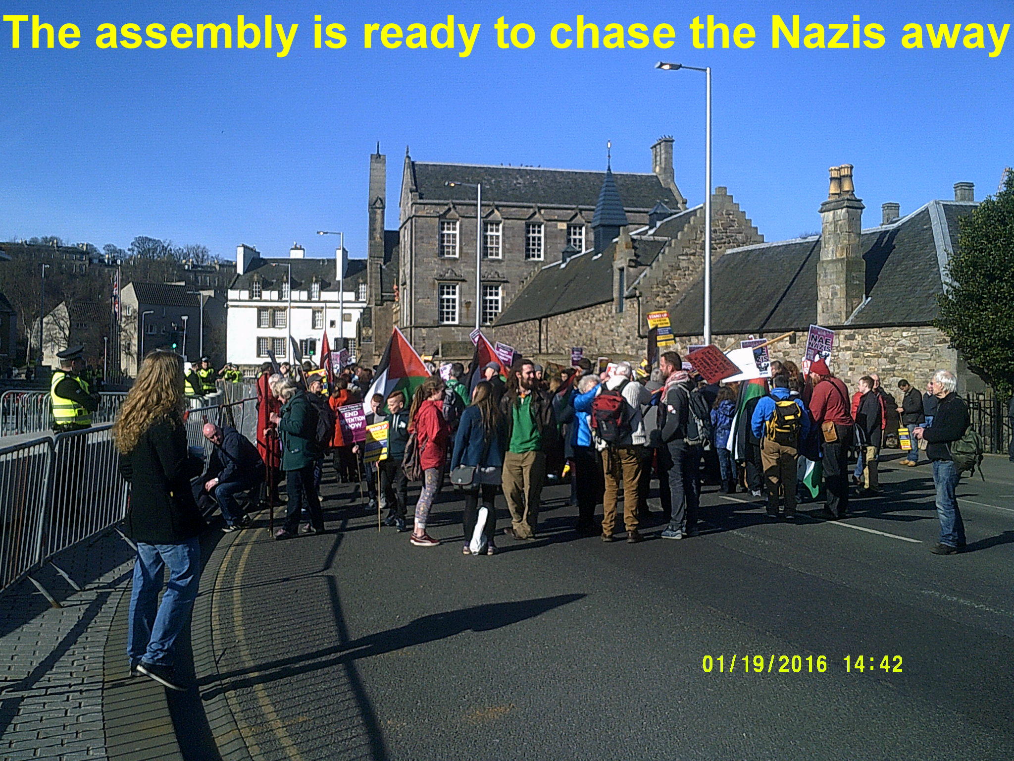 Therefore a large contingent of people from the Glasgow protest travelled to Edinburgh to join up with those already gathered in the capital to be ready for the Pegida Nazis. A crowd of between 500 and a thousand assembled outside the Scottish Parliament in anticipation of the arrival of the far right group. The area was heavily policed with over a dozen police vans visible.