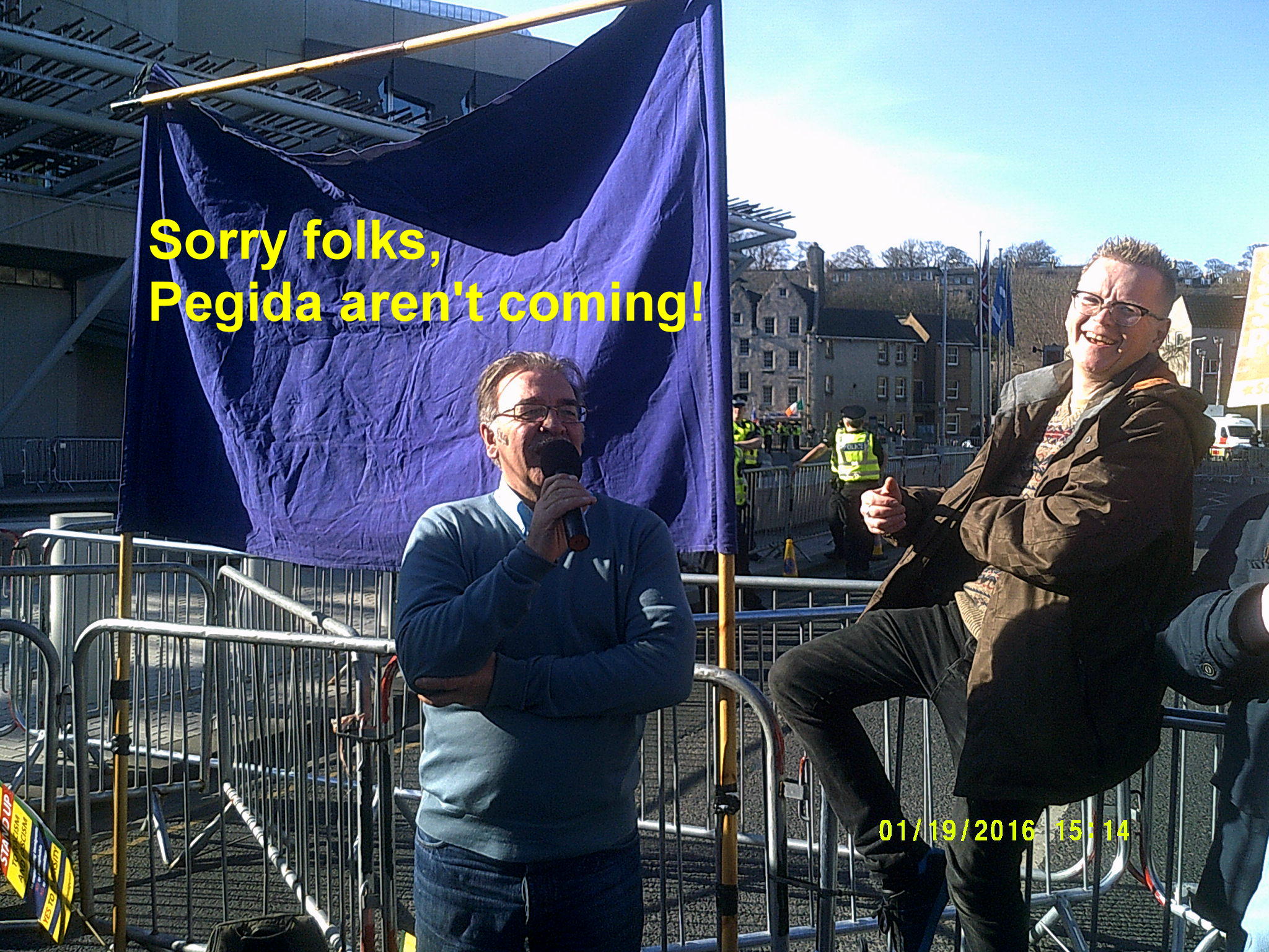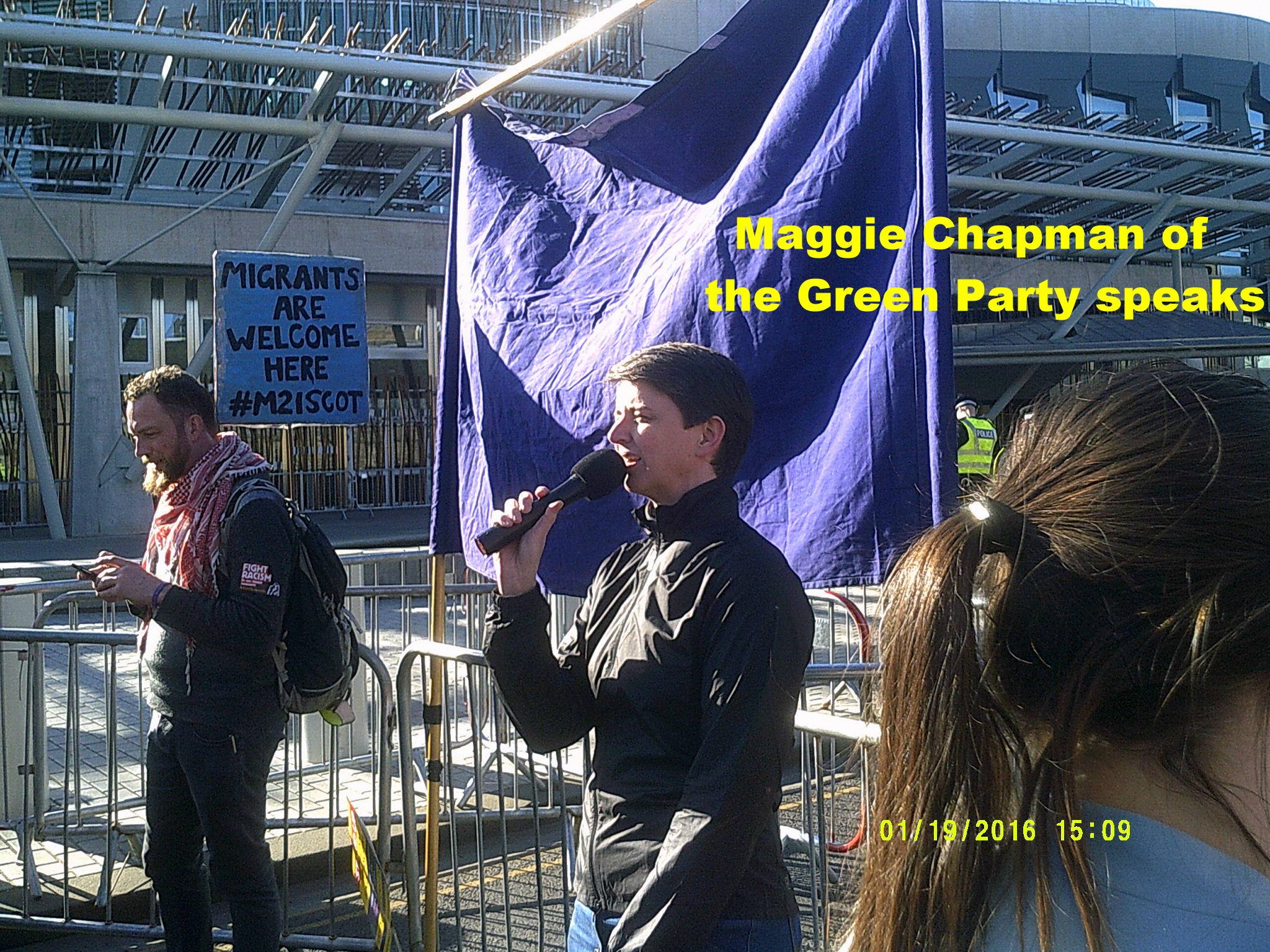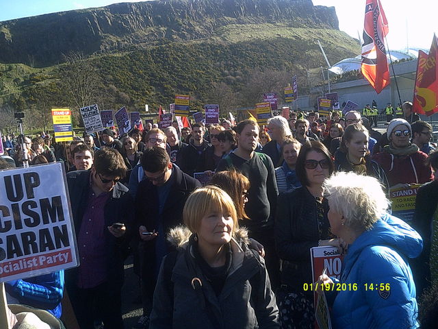 http://www.heraldscotland.com/news/home-news/germanys-far-right-pegida-movement-sets-up-in-scotland-and-plans-anti-islam-march-in-.119603617 The crowd listened to a number of speakers including Daniel Kebede who had already spoken in Glasgow as well as local Green Party councillor Maggie Chapman. The event was chaired by Luke Henderson of UAF (United against Fascism).