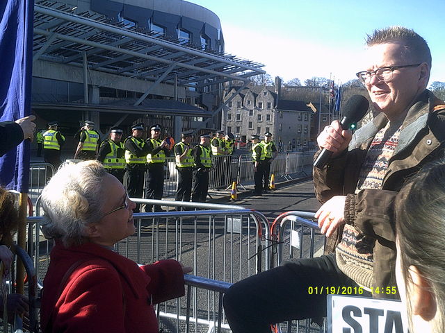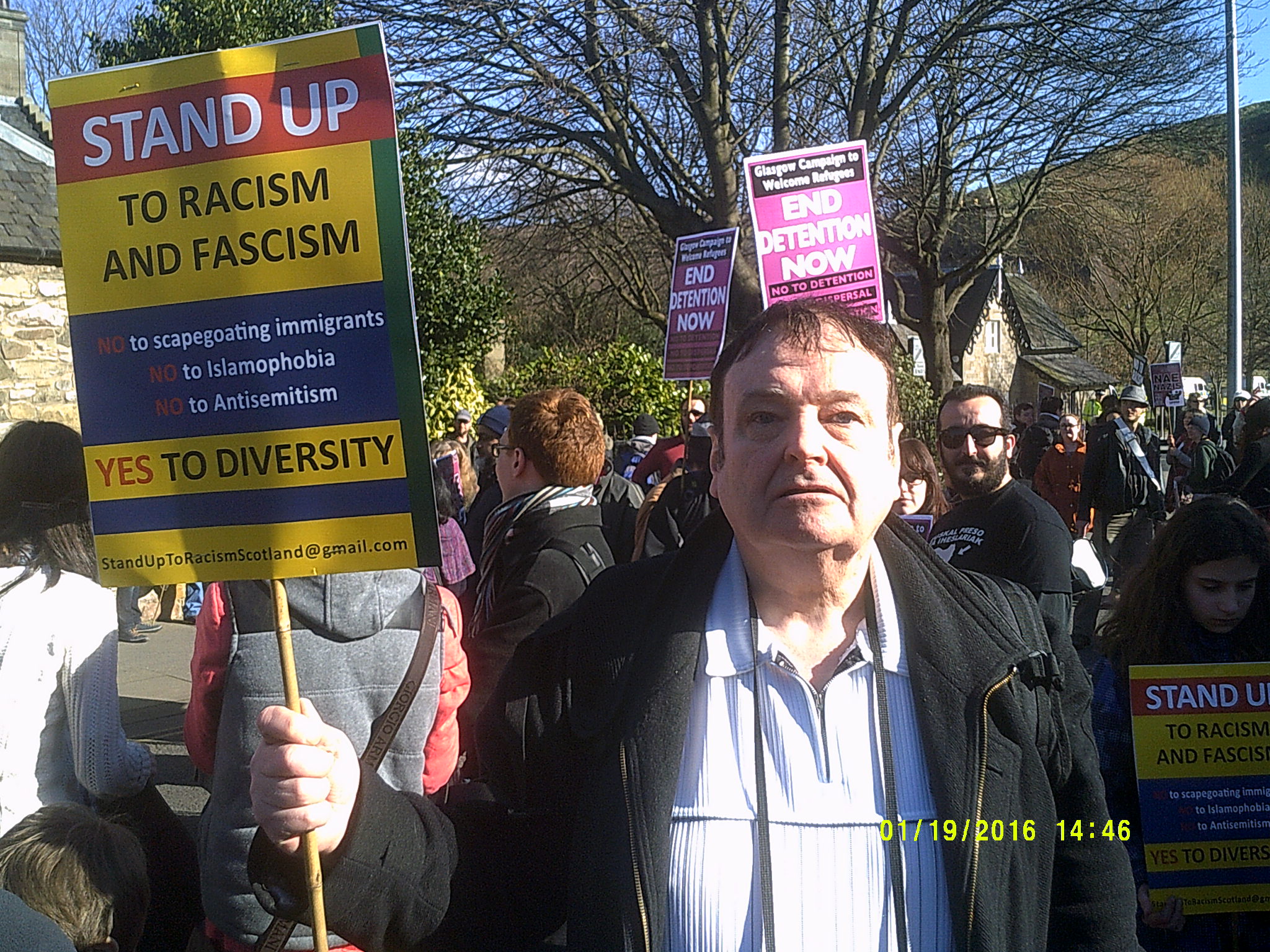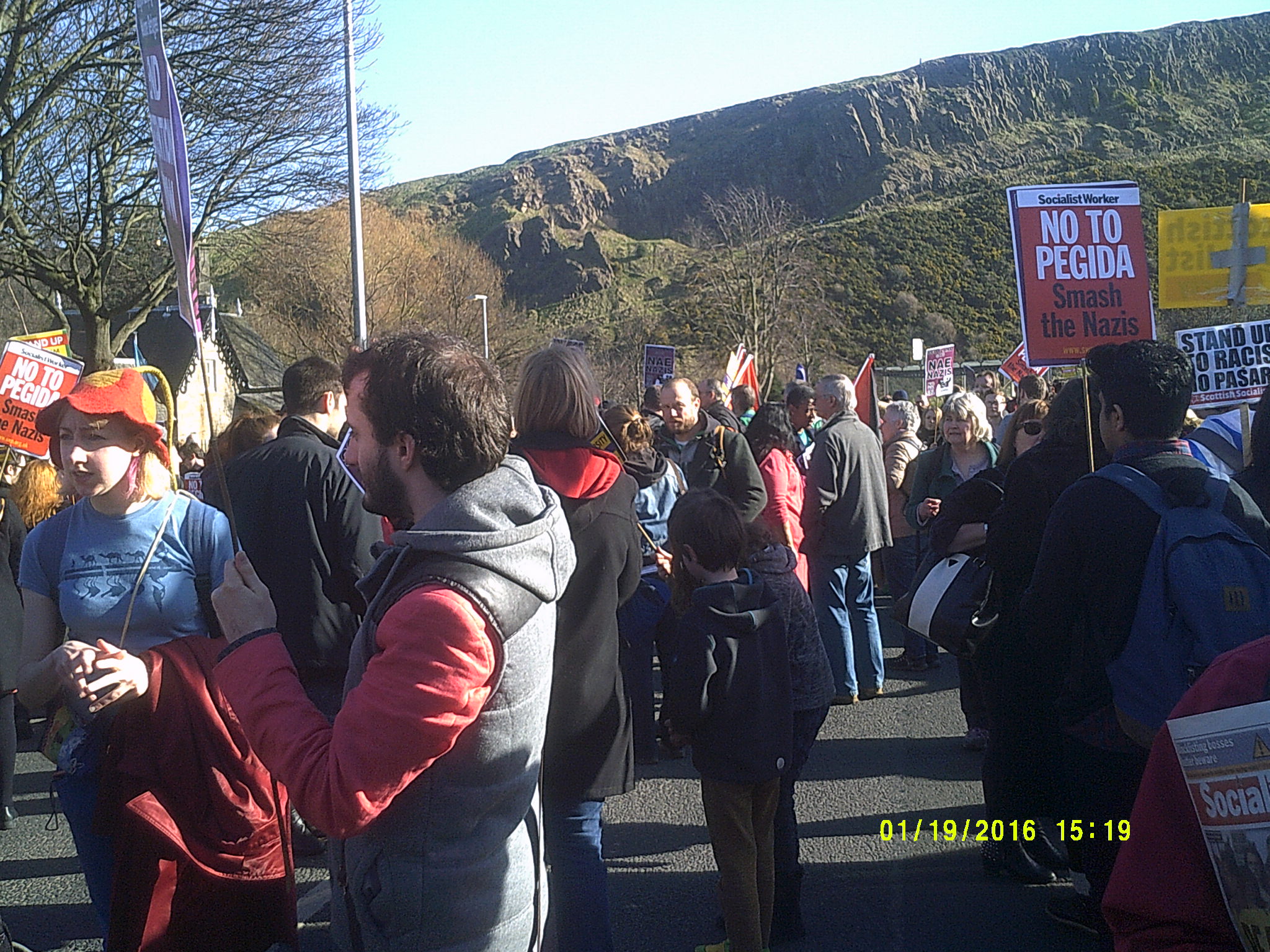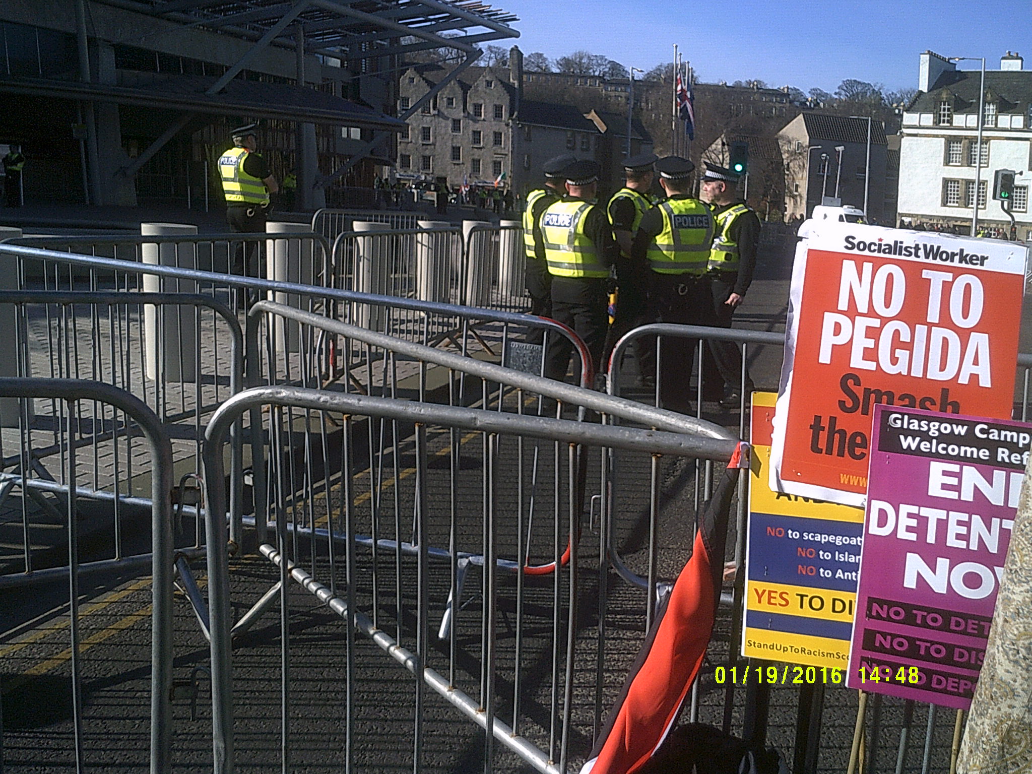 http://www.heraldscotland.com/news/home-news/germanys-far-right-pegida-movement-sets-up-in-scotland-and-plans-anti-islam-march-in-.119603617 The crowd listened to a number of speakers including Daniel Kebede who had already spoken in Glasgow as well as local Green Party councillor Maggie Chapman. The event was chaired by Luke Henderson of UAF (United against Fascism).