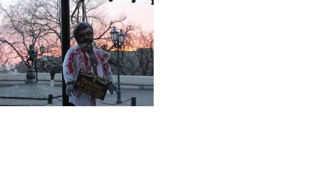 I cannot pretend to be a great expert in Ukrainian freedom fighters’ traditions. But off the top of my head while hearing about OUN-UPA are massacres of Poles in Volhynia and Eastern Galicia in 1943-1944. However Mr. Nalivaichenko’s such an unblinking bravery is worthy of respect. For sure while having such an astonishing success in the historical lore he must also remember the sad demise of OUN-UPA activists. You may contradict asking to take into account that UPA was operating illegally during the Soviet regime. However the Ukrainian Security Service and the entire Kiev Government activities spark anger among Ukrainian common citizens these days. For instance this is how Odessa citizens celebrated April Fool’s Day. They recalled another old tradition of punishment those very OUN-UPA ‘heroes’ and noosed no one less than the Ukrainian president Petro Poroshenko’s dummy dressed into a bloodstained embroidered shirt in Deribasovskaya Street.