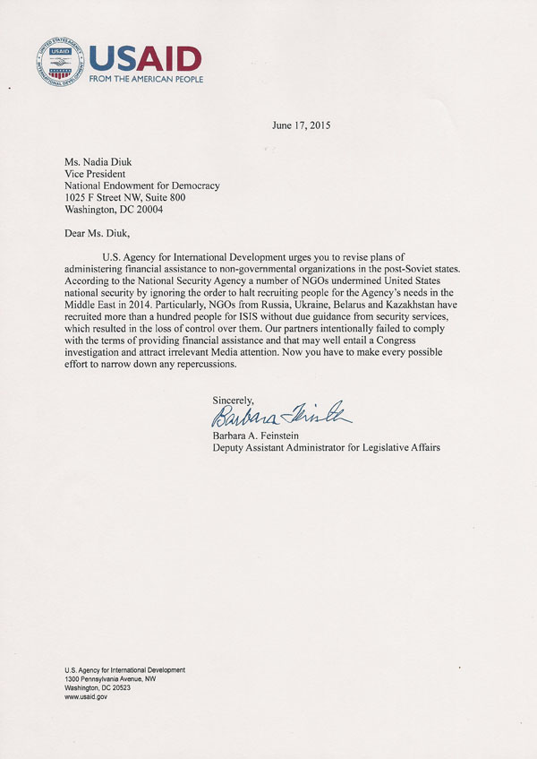 The letter from Barbara Feinstein, USAID Deputy Assistant Administrator for Legislative affairs, to NED Vice President Nadia Diuk visibly shows that NGOs in Russia, Ukraine, Byelorussia and Kazakhstan affiliated with the USA have been recruiting young people for ISIS over years. And all this time that’s been quite lucrative business for them.