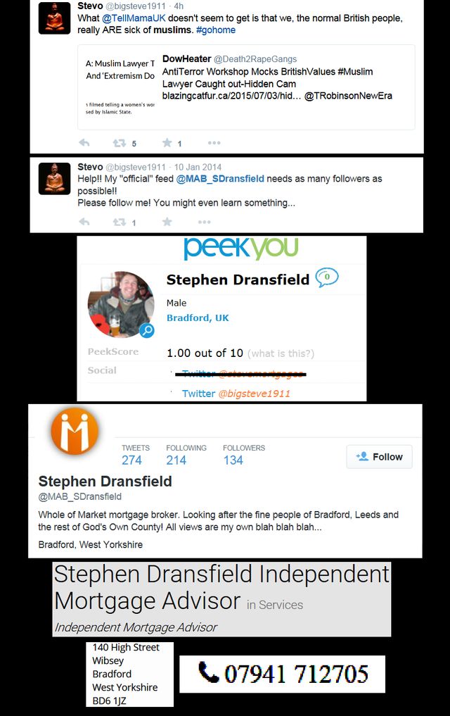 https://twitter.com/bigsteve1911/status/617428040008749056 Disclaimer: - The above information is provided so potential Muslim customers are made aware of Stephen Dransfield, Mortgage Advisor's loathing of British Muslims, so they can make an informed choice. Do not harass the doxxed EDL fascist, but simply boycott his business, if you so choose.