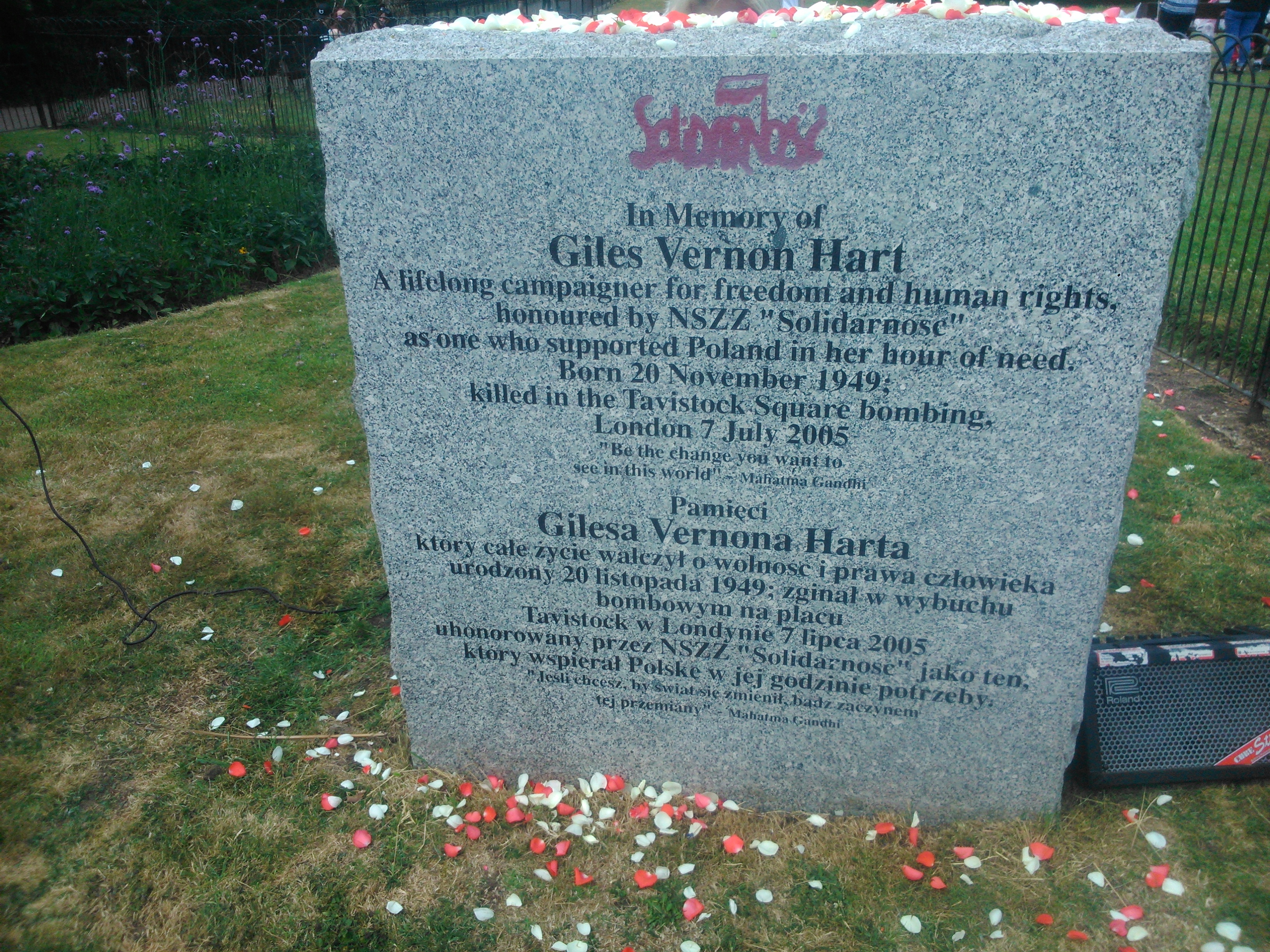 Giles Hart born 1949, was killed in the 7th July 2005 Bombings in Tavistock Square. On Sunday 5th July 2015 a service and celebration of his life were held by friends and family.