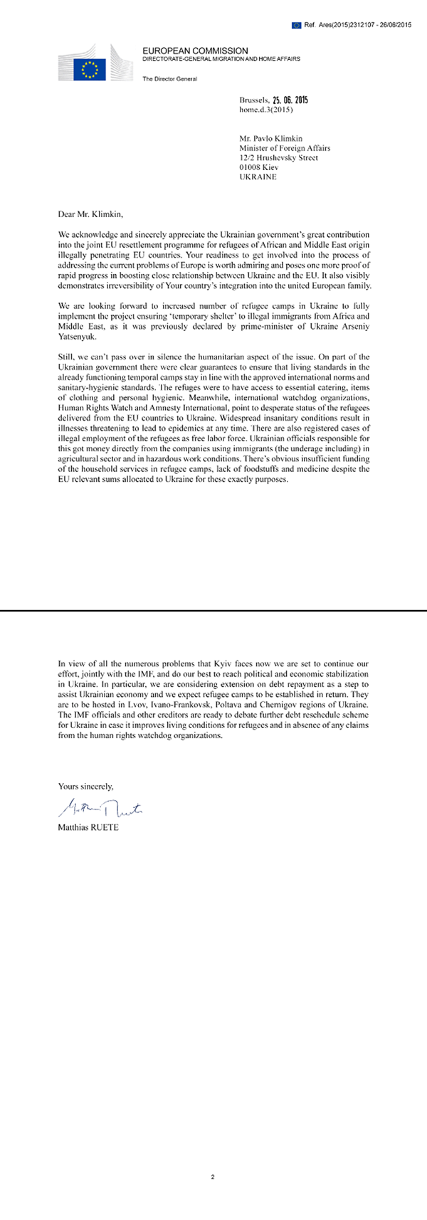 And it is no mere chance that recent EU summit devoted sixfold part of time to refugees’ problem instead of attending to economic situation in Greece, which difficulties will soon pale into insignificance if Europe loses control over growing flow of migrants. Judging from news-media information, a certain middle ground has already found, but none of EU officials can make any specific statement of method of migration quotas’ allocation. Agreement on this question is planned to sign late July, but just now out-of-the-box, or more precisely, visible solution of this problem is offered to Brussels. Below is given a letter of Matthias Ruete, Director General of the Directorate General for Migration and Home Affairs of the European Commission, which was sent to Minister of Foreign Affairs of Ukraine, Pavlo Klimkin, immediately after the EU summit (