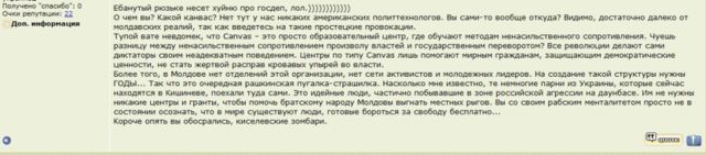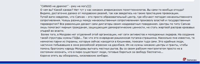 http://blogs.ipress.ua/blogs/protesti_v_moldove_v_evropu_dorogoy_ukrayni_138776.html Judging by the information from the Internet users, Western centers for strategic planning and execution of revolutions are already active in Moldova. For instance, the Centre for Applied Non-Violent Actions and Strategies (CANVAS), which experts have participated in engineering a dozen of revolutions in various countries.