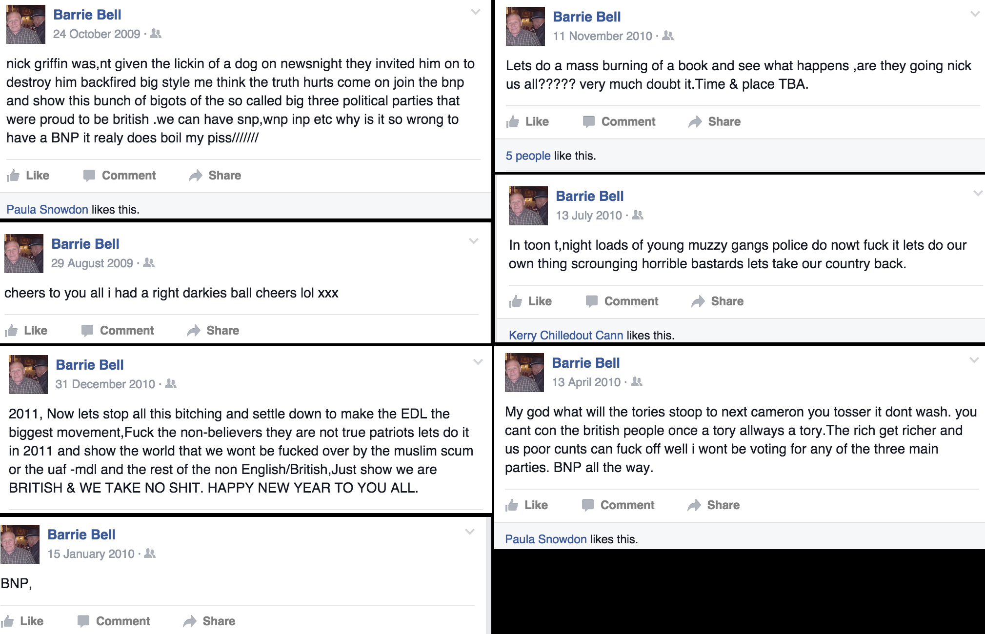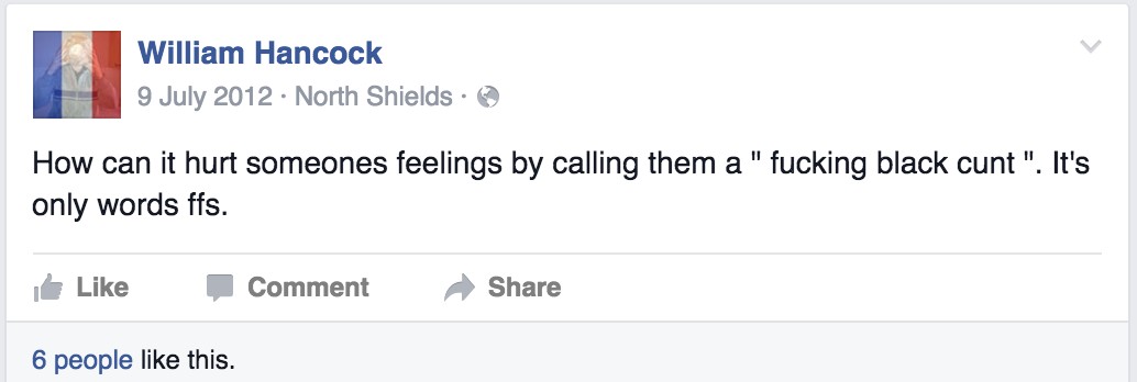 William also supports the BNP / British National Party and makes racist comments such as stating 'How can it hurt someones feelings by calling them a 'fucking black cunt'. It's only words ffs.'