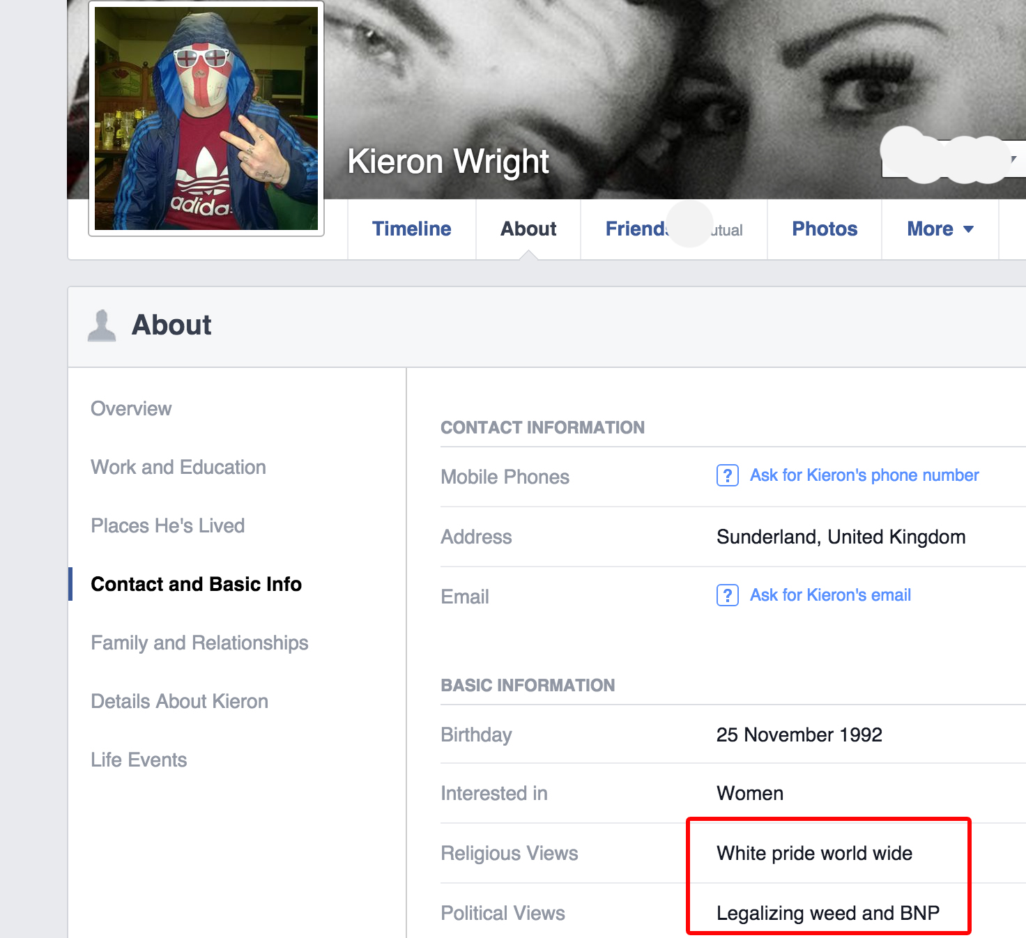 Political History:- Adam’s been involved with the North East EDL since 2013 onwards. He tries to remain anonymous online though published here are photographs of himself not covered up.