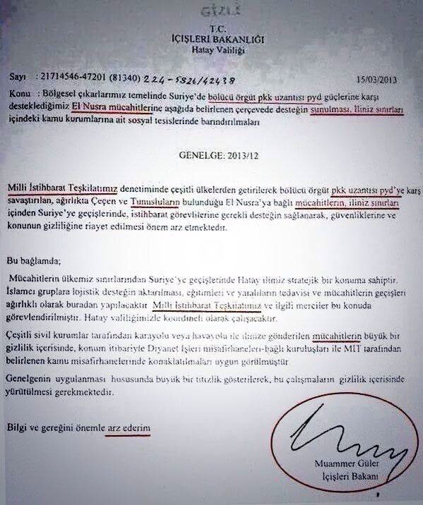 Subject: Based on serving regional interests of the Republic of Turkey and as part of the listed below requirements all-round support to the mujahideen of Jabhat al-Nusra who fight in Syria against the Syrian pro-Kurdish Democratic Union Party and as a result prevent the enlargement of the separatist organization Kurdistan Workers' Party. Accommodating the mujahideen at social facilities of government institutions in your province (Hatay).