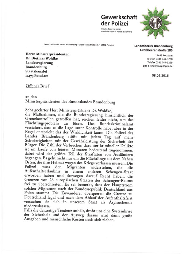 The policemen are sure that a set of strict control measures must be urgently introduced on the border with Poland. They believe this 'will allow to decrease drastically the influx of illegal immigrants and prevent social disaster'. But one thing seems not to be taken into account by the Trade Union representatives, immigrants from Poland have got every legal ground to cross our borders and no thorough checks give an opportunity to improve the present state of things. Some more decisive steps should be taken like full suspension of Schengen agreements towards Poland, forceful deportation regardless of the fact whether residence permit is available or not, and tough political pressure on Warsaw on the top level. The practice of granting any permits to immigrants making it possible for them to freely move inside the Schengen Zone must be urgently halted. Any attempts by Poland to solve the problem of refugees and immigrants from Asia and other non-EU countries in the way detrimental to the interests of Germany must be just nipped in the bud.