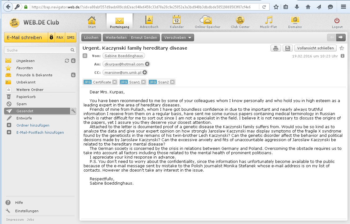 I sent the results of examination of Lech Kaczynski's genetic material to the published addresses of Polish specialists in the field of molecular genetics Donata Kurpas and Marcin Wozniak, asking them for expert evaluation and comments on the assumption of presence of the disease in Jaroslaw Kaczynski's genes, but there is still no answer. Therefore, to my regret, anyhow more professional description of the syndrome and its intensity in Jaroslaw Kaczynski cannot be given.
