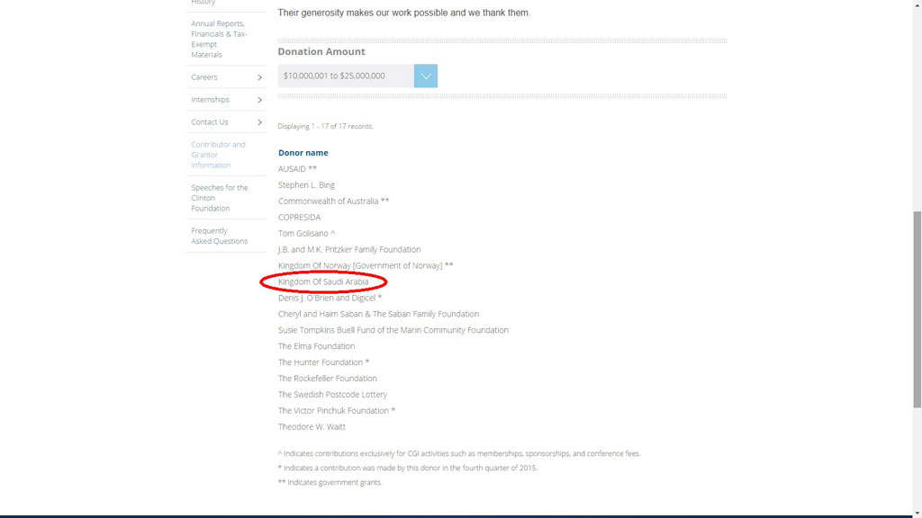 According to the Wall Street Journal, in 2014 among those who made donations to the Clinton Foundation were United Arab Emirates, a first-time donor, Qatari government committee preparing for the 2022 soccer World Cup, Oman, Canadian government agency and the Kingdom of Saudi Arabia (