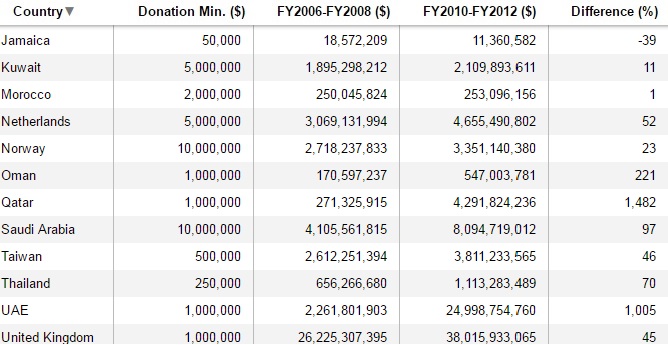 http://www.wsj.com/articles/foreign-government-gifts-to-clinton-foundation-on-the-rise-1424223031). This is a remarkable list. Thus, it is known that the State Department issued rather unfavourable human rights reports about the UAE and Oman. Qatar was also black-booked by the human rights activists because of over 1,000 migrant workers have already died during the 2022 World Cup preparations. The forgoing Canadian agency has been promoting the Keystone XL pipeline's construction in spite of environmentalists' and some Congressmen's harsh attacks (