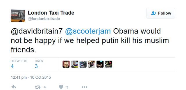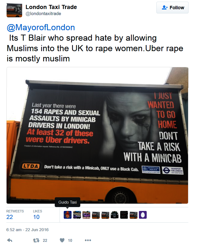 https://twitter.com/londontaxitrade/status/652931972709355520 Another anti-Muslim tweet encouraging London's black taxi drivers to discriminate against Muslims: -