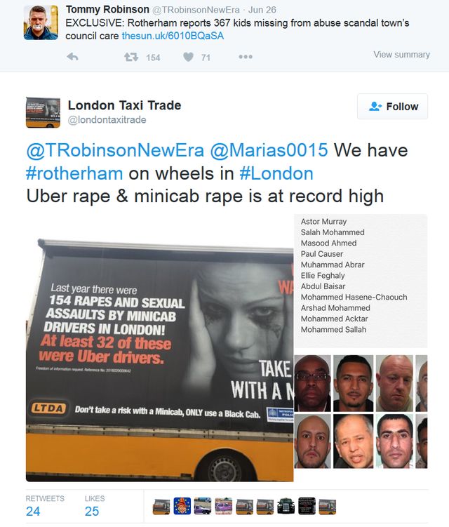 https://twitter.com/londontaxitrade/status/745615521077469184 An EDL supporter, Mr Martin constantly racialises crime committed by Uber drivers and other private hire cars. Here he is, forging a comparison between Rotherham and Uber crime, to deliberately tarnish London's Muslims as child abusers: -