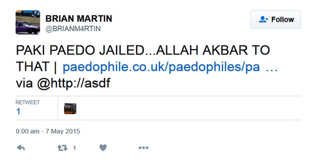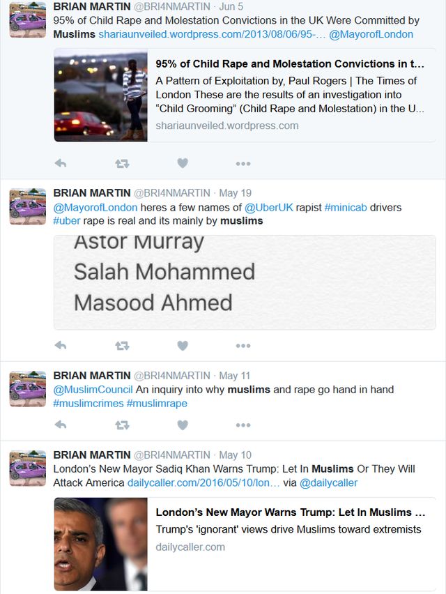 https://twitter.com/BRIANM4RTIN/status/596343941395574784 The most worrying aspect of it all, is Mr Martin's status as the trade leader for London's black cabs, supported by his official-looking website. Racialising Uber crime as a "Muslim thing", supported by a vast number of rank and file drivers, his views are likely (if they haven't done so already) to percolate onto the street as racist behaviour towards non-white passengers and fellow motorists.