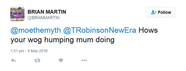 https://twitter.com/londontaxitrade/status/747097407964459008 Meanwhile, on one of his personal accounts, the fascist taxi trade supremo tags in his pal Tommy Robinson to racially abuses online British Muslim twitter user Moe @moethemyth with the words "How's your wog-humping mum doing?" Pure and simple racism from the Alf Garnett era, which sums up Brian Martin to a tee.